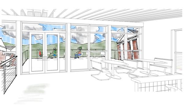 The intention of the design is to communicate inclusiveness, progressivism, and transparency by opening up the building’s volume toward the public square and providing a balcony/mezzanine overlooking the assembly space on the inside and the Civic Center with the mountains beyond on the outside. Daylight floods the interior through the 2-story glass front facade, large side windows, and skylights above. For economy, a pre-engineered metal building system is employed for the building shell. The facility will be powered by an array of solar panels located on the south-facing roof.